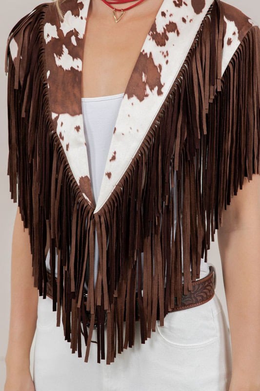Bold Western-inspired vest in soft faux suede with classic brown-and-white cow print. Features long, flowing fringe and open-front design for easy layering.