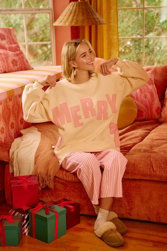 Cream and pink MERRY sweater with cute accent bows on the side with fleece. Perfect for a cozy day!