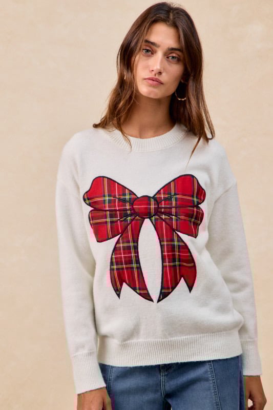 Add festive charm to your winter wardrobe with this cozy plaid bow sweater. Featuring a bold, oversized tartan bow graphic on a soft cream knit, this playful piece brings a cheerful holiday touch without sacrificing comfort. The classic crew neckline and relaxed fit make it easy to style with jeans, skirts, or lounge pieces for a look that’s both cute and cozy. Perfect for holiday gatherings, gifting, or spreading seasonal cheer all winter long.