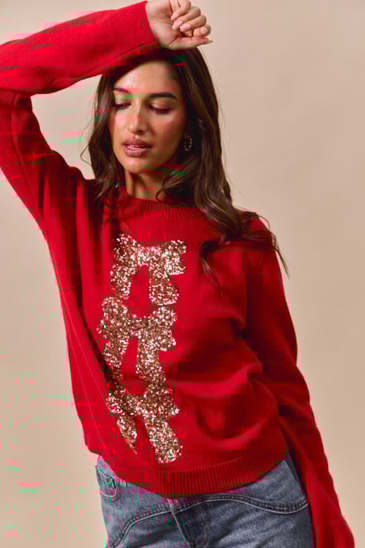 Holiday perfect! Red sweater with 3 gold bows, soft and cozy.