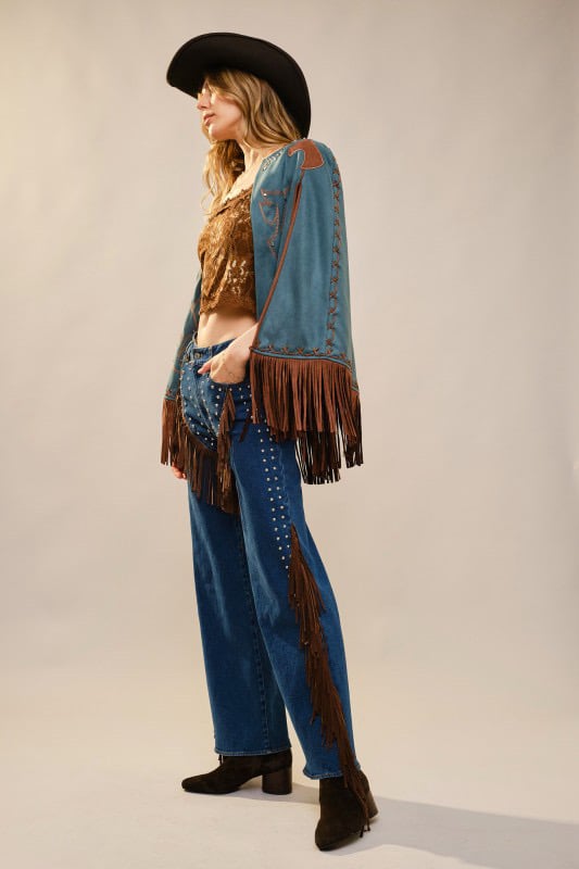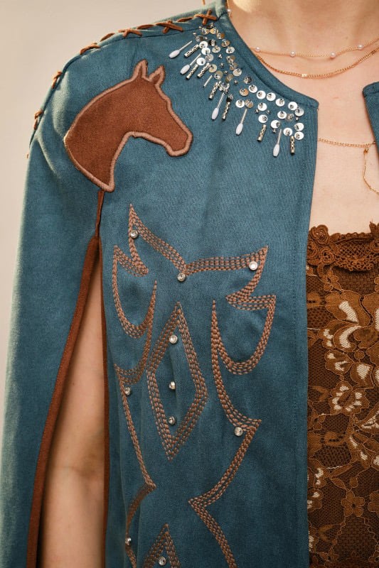 Make a statement with this stunning western-inspired cape, designed to turn heads from the rodeo grounds to a night out. Featuring rich teal fabric with intricate embroidered detailing, stud accents, and playful fringe trim, this cape layers effortlessly over your favorite tops. The open-front silhouette drapes beautifully, adding movement and texture to any outfit. Style it with denim and boots for a bold, confident look that feels both timeless and on-trend.