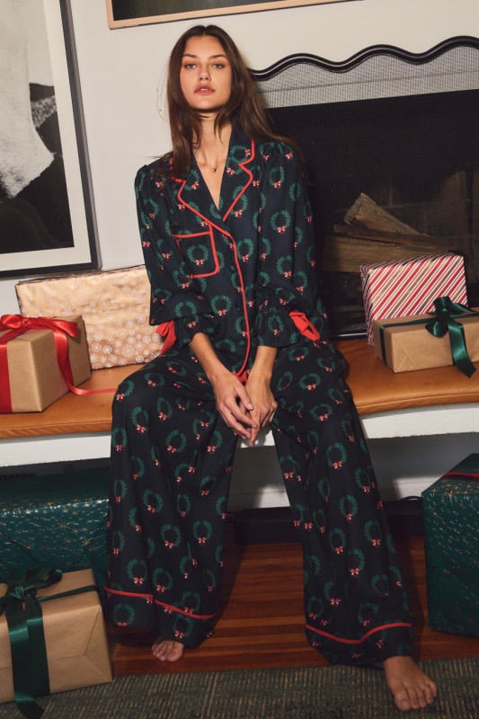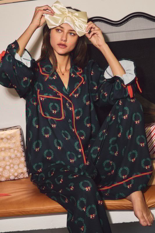 Wrap yourself in festive comfort with this holiday pajama set, designed to feel as good as it looks. Featuring a classic button-up top and relaxed, wide-leg pants, this set is crafted in a deep evergreen tone adorned with a subtle wreath print and contrast piping for a polished finish. Soft, lightweight fabric offers an easy drape and all-night comfort, while adjustable details add a touch of effortless charm. Perfect for cozy nights in, holiday mornings, and everything in between—this is loungewear made to celebrate the season in style.